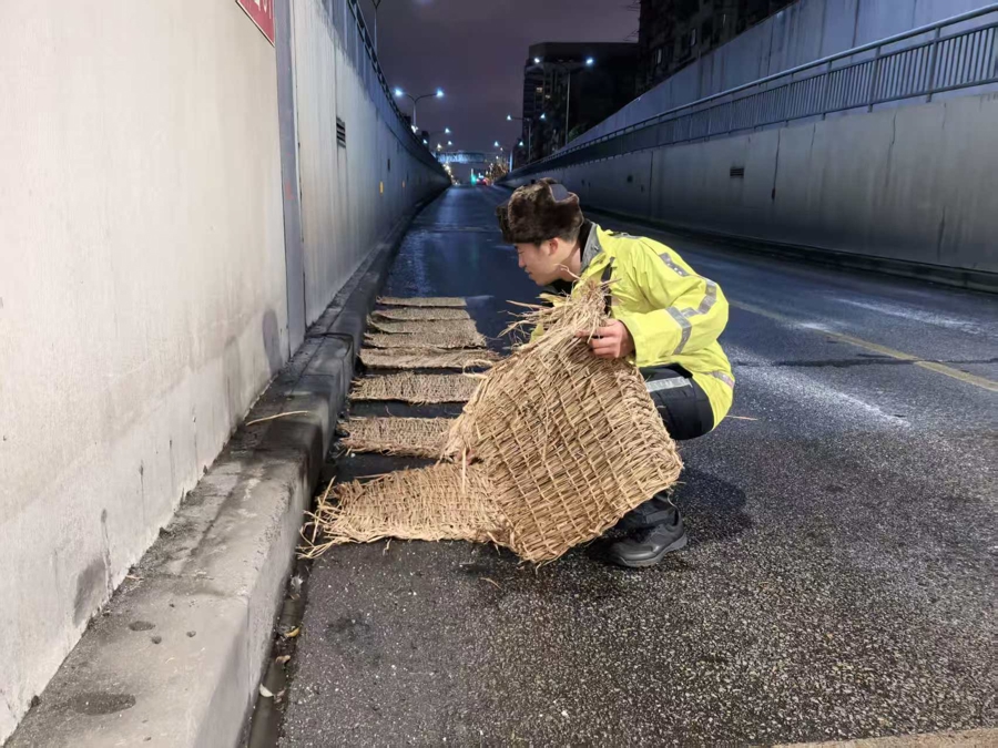 浦东公安交管支队民警也提前上岗,对辖区易结冰路段点位开展要点巡查,并在羽山路下立交等处铺设稻草注重谈路结冰。