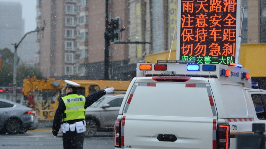 闵行公安交管支队民警提前上岗,在风雪中领导指令早岑岭交通
